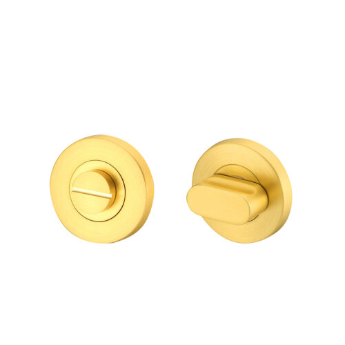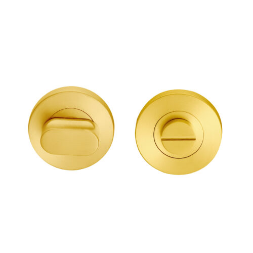 Dit type rozet met toilet-badkamersluiting is een subtiel vormgegeven, functioneel en stijlvol afwerkingsonderdeel voor binnendeuren die voorzien zijn van een toilet- of badkamerslot. Het product is vervaardigd uit hoogwaardig roestvast staal (RVS). De afwerking in geborsteld messing zorgt voor een strakke, matte uitstraling die uitstekend past binnen een modern, industrieel of minimalistisch interieur.