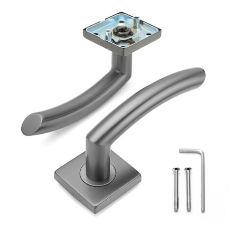 Deze elegante deurkruk uit de Donna serie met vierkante rozet biedt een strak en modern design in combinatie met hoogwaardige duurzaamheid. Ideaal voor binnendeuren in zowel woon als werkomgevingen. De gebogen hendel met een diameter van 20 mm ligt prettig in de hand en is haaks gemonteerd op een geveerde vierkante rozet van 53×53 mm en slechts 9 mm dik wat zorgt voor een minimalistische en verfijnde uitstraling.