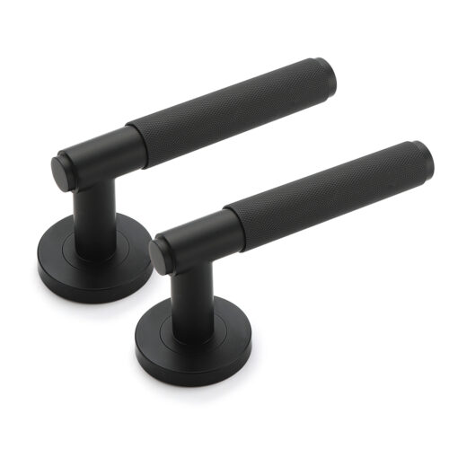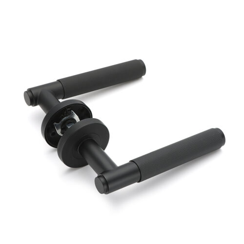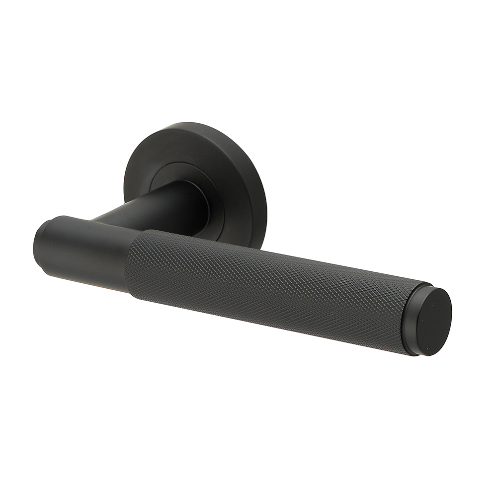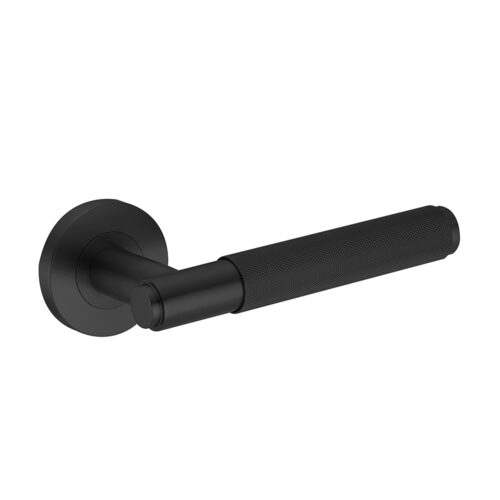Deurkruk Eva rond geribbelde diamant greep 22mm haaks met een schroefrozet mat zwart PVD gecoat voor binnendeuren
