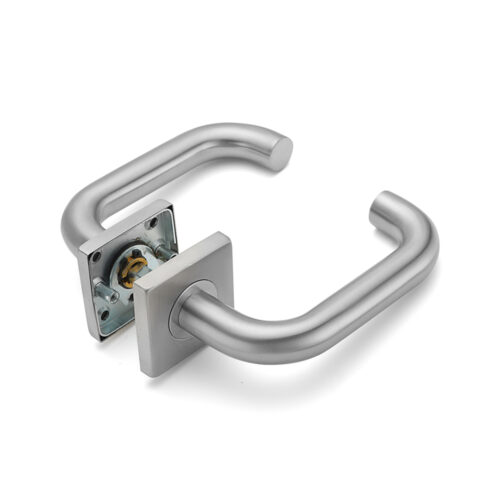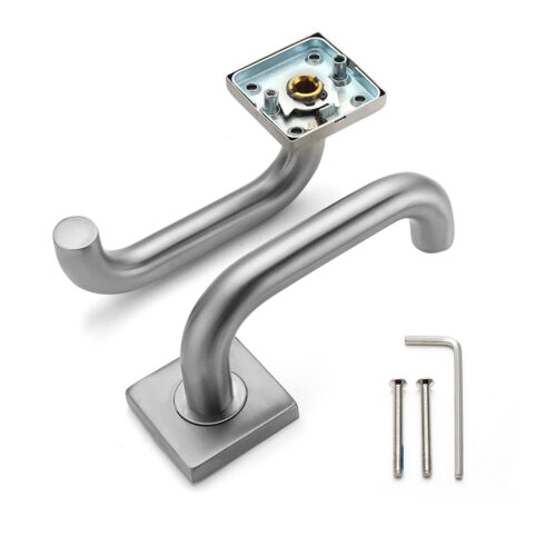 Deze elegante deurkruk uit de Leonardo-serie met vierkante rozet biedt een stijlvol en eigentijds design in combinatie met hoogwaardige duurzaamheid. Ideaal voor binnendeuren in zowel woon- als werkomgevingen. De gebogen hendel met een diameter van 20 mm ligt prettig in de hand en is haaks gemonteerd op een geveerde vierkante rozet van 53×53 mm en een dikte van slechts 9 mm. Dit zorgt voor een strakke en verfijnde uitstraling die moeiteloos aansluit bij uiteenlopende interieurstijlen.