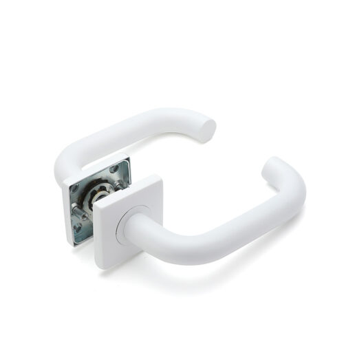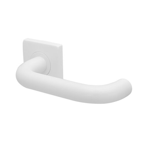Deurkruk Leonardo rond model u 20mm haaks op vierkant rozet mat wit PVD gecoat voor binnendeuren
