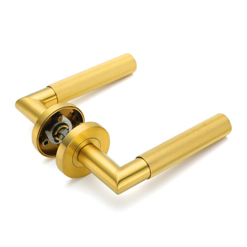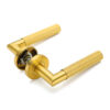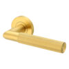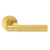 Deurkruk Pia rond massief geribbelde diamant greep 22mm haaks met een schroefrozet geborsteld messing PVD gecoat voor binnendeuren
