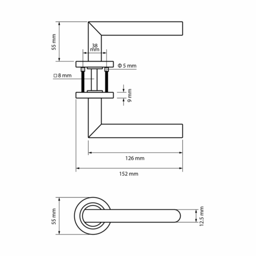 De hendel is haaks gemonteerd op een ronde geveerde rozet met een diameter van 55 mm en een slanke dikte van slechts 9 mm. Dit zorgt voor een minimalistisch en elegant silhouet dat moeiteloos aansluit bij diverse interieurstijlen.